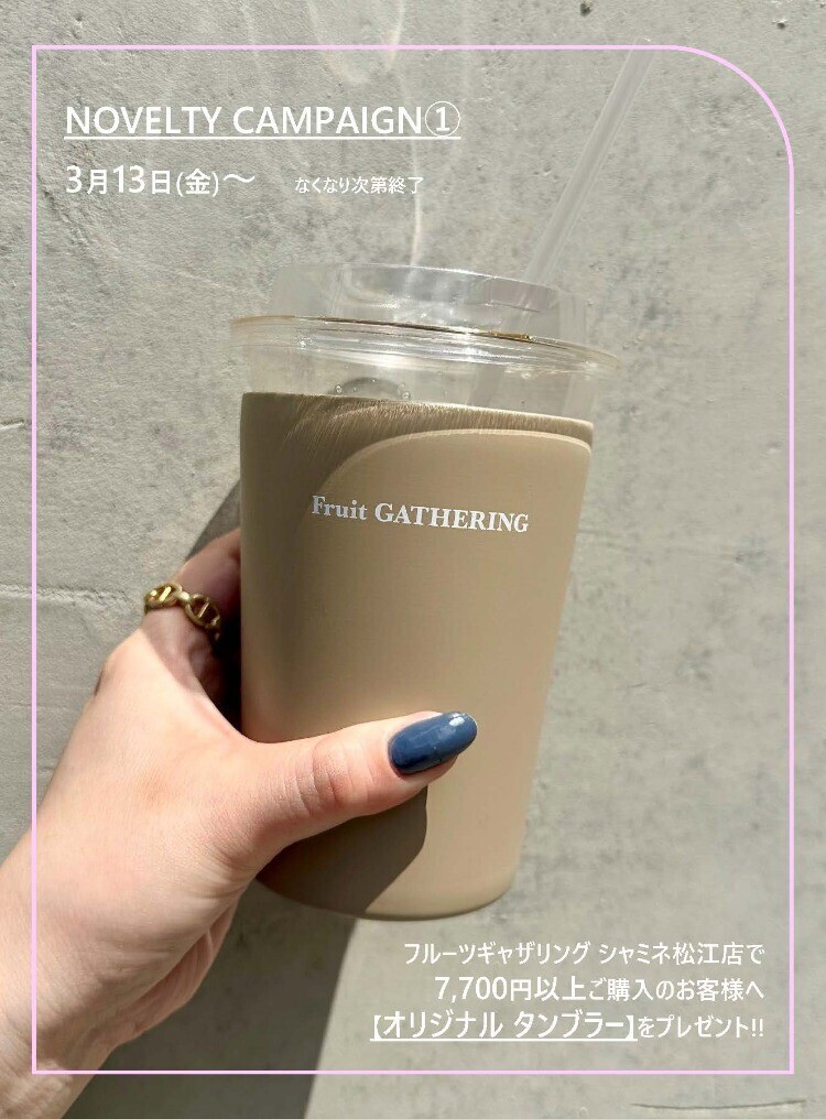 ①3/13(金)~ フルーツギャザリング シャミネ松江店で、7,700円(税込)以上ご購入のお客様へ【オリジナル タンブラー】*をプレゼント