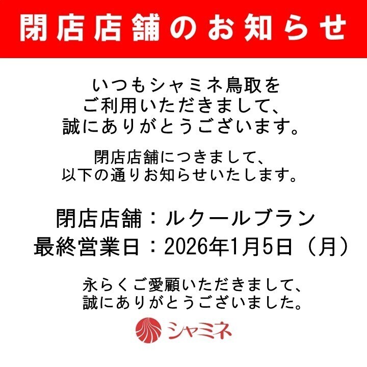 「ルクールブラン シャミネ鳥取店」閉店のお知らせ